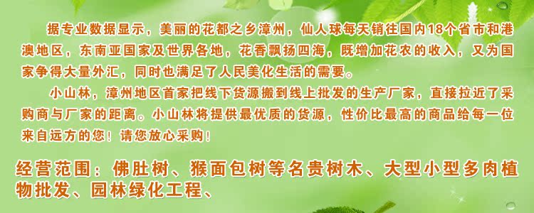 小山林花卉園藝場位于美麗的花都之鄉(xiāng)漳州龍海市,是一家專門研發(fā),生產(chǎn),銷售的花卉企業(yè),園藝場常年出售:仙人球,多肉植物,猴面包樹,佛肚樹象腿木,羅漢松等各種名貴樹木,并且承接小區(qū)、廠房、別墅、學(xué)校等各種綠化工程的設(shè)計、施工和養(yǎng)護(hù)管理!我們所提供的仙人球與多肉植物是全國同行業(yè)中種類豐富的,有近2000多種品種,擁有多個基地(龍海種植展示基地,漳州種植展示基地)總面積可達(dá)300多畝,近幾年,我們綜合了基地 公司 網(wǎng)絡(luò)的模式,通過互聯(lián)網(wǎng),把我們的產(chǎn)品展示出去。在全國已有相當(dāng)?shù)闹?,我們還會盡的努力,繼續(xù)引進(jìn),培育更多優(yōu)質(zhì)品種。將這些健康植物普及到所有人手里,讓所有人能夠了解多肉植物在家庭園藝,景觀應(yīng)用中的無限樂趣,讓人領(lǐng)會生活的多姿多彩。未來的路希望能與大家攜手前進(jìn)。