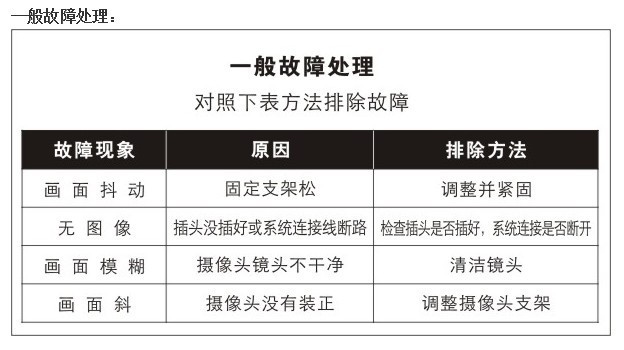 5.5M視頻線 1M電源線電源:DC12V制式:PAL/NTSC2路視頻輸入,倒車優(yōu)先攝像頭防水等級:IP68防水設(shè)計,經(jīng)嚴格浸水測試