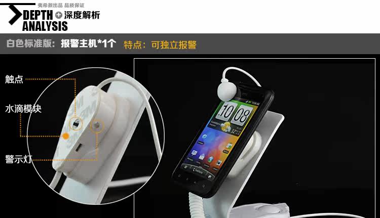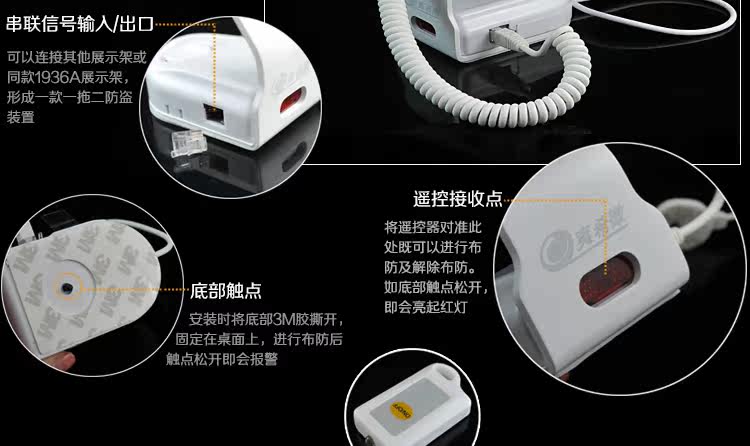 本防盜展示架顧名思意,主要用于手機(jī)真機(jī)的展示多功能防盜體驗(yàn)架,當(dāng)然也適用于電吹風(fēng)、家電遙控器、剃須刀等小家電的防盜演示。本品由展示架 報(bào)警主機(jī) 紐扣電池幾部分組成,并自帶充電插口,可選充電功能。在使用過(guò)程中根據(jù)布防后指示燈亮光狀態(tài),當(dāng)指示燈發(fā)紅光時(shí)要記得即時(shí)充電,指示燈亮綠光表示正常工作,更多細(xì)節(jié)請(qǐng)咨詢我們?cè)诰€客服。