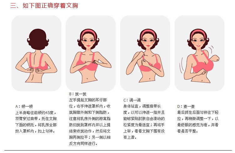五、正確的收藏有人覺得內(nèi)衣是怕見人的,所以晾在背人的地方,收也收在角落里。我們說,內(nèi)褲是應(yīng)曬干才能滅菌,而文胸是應(yīng)陰干的,以免曬黃,或使彈性減弱。事實上你的衣柜不會有外人去看的,你可以把文胸折起,背帶、肩帶放進杯內(nèi),放在所有衣物的上端,或是兩三件疊起來,這樣都不易變形,如果往衣服下面隨便一塞,衣服太重會壓壞鋼圈。