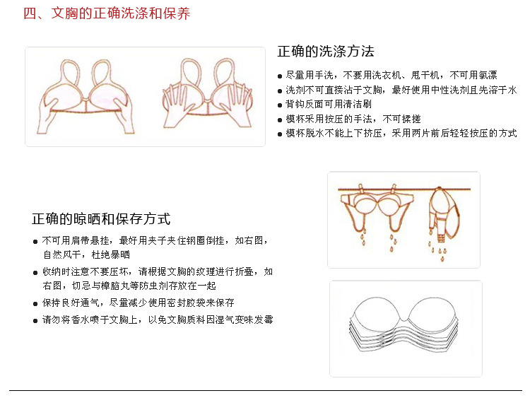 3.太陽光的直射是文胸變黃、褪色、布料弱化的原因,室內(nèi)暖氣亦會造成變黃,請避免。