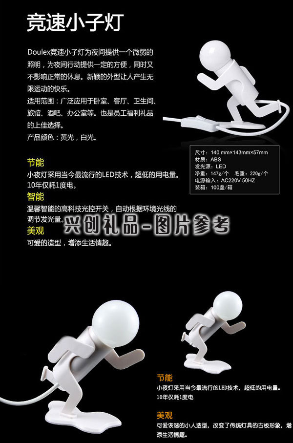 方便實(shí)用的Doulex跑步小人LED小夜燈,能使你在晚上有個(gè)溫馨的室內(nèi)環(huán)境,用電很少,利用LED發(fā)光二極管更加省電,使用中有下列特點(diǎn):