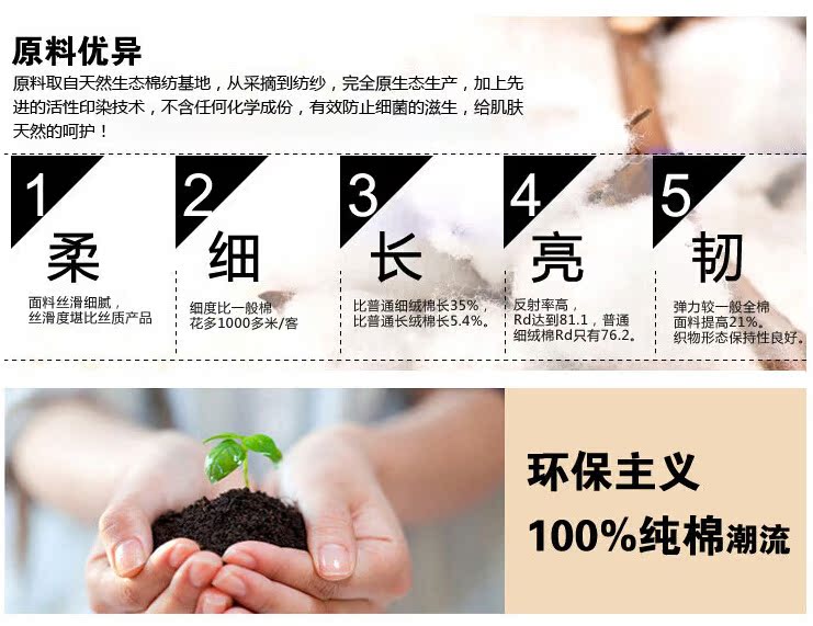 2面料:采用100%純棉面料 手感細(xì)膩柔軟 親膚透氣 具有良好的吸濕性 質(zhì)感較平穩(wěn)厚重 較耐磨 不易起球色彩光澤度鮮明 舒適 對(duì)皮膚零刺激~