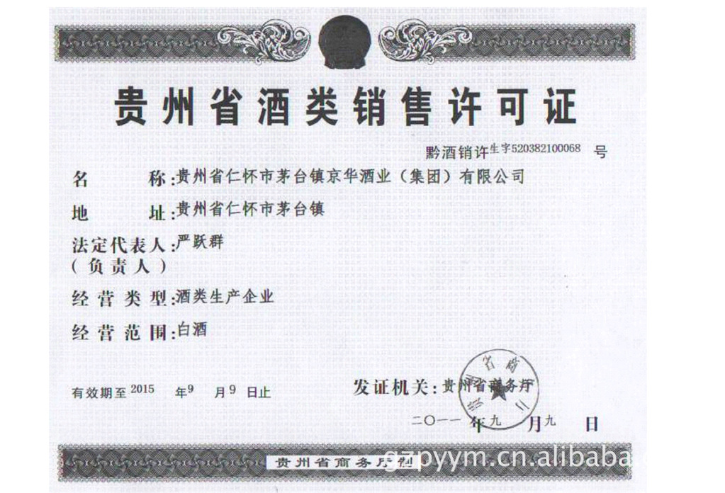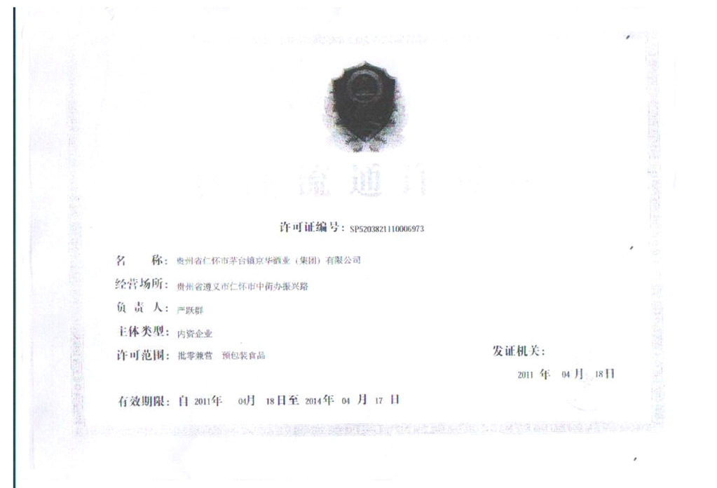 酒廠已通過ISO9001國際質(zhì)量管理體系認證和HACCP食品安全管理體系認證。生產(chǎn)許可證編號:QS5200 1501 0056食品衛(wèi)生許可證:黔衛(wèi)食證字[2009]第520382-161084號