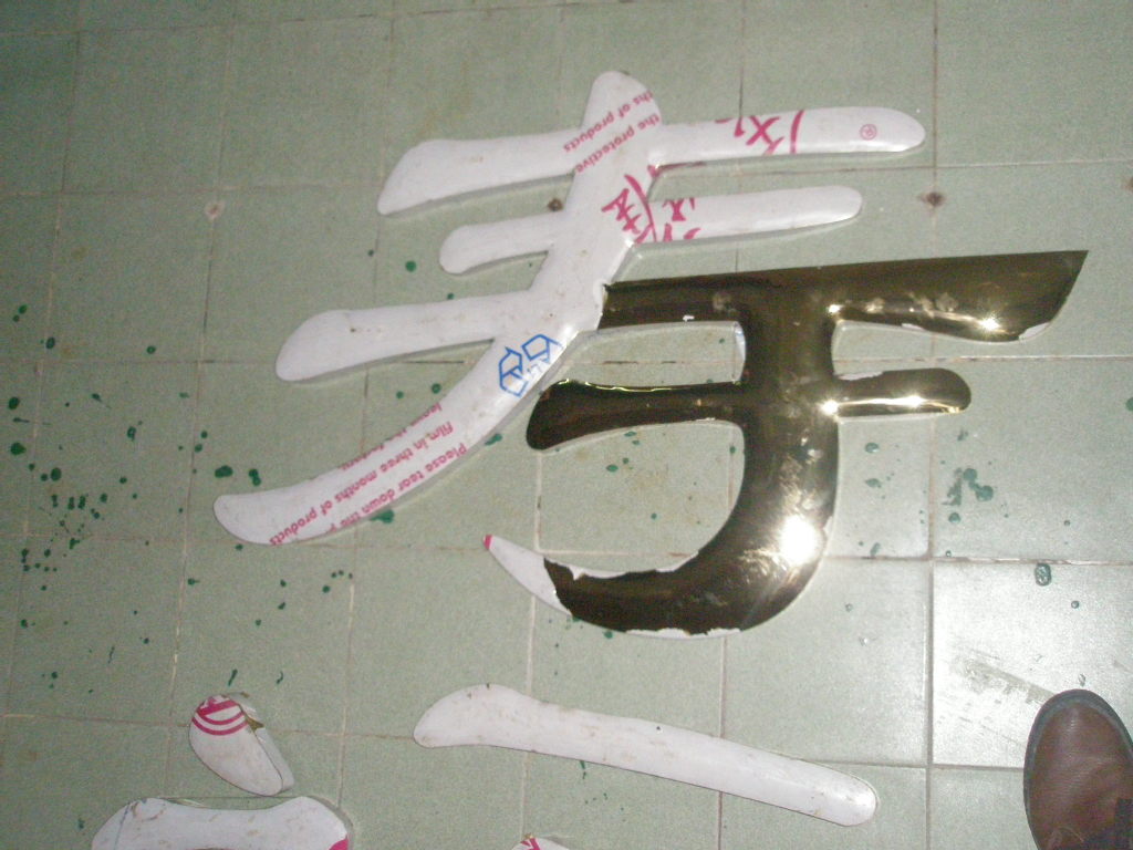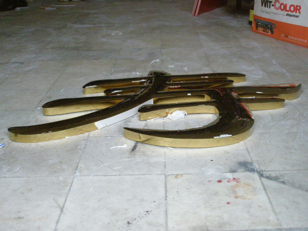 十二)安裝:鈦金字安裝有明暗兩種:明安裝,字按位置放好,在吊掛處做上記號(hào),將字移開,用沖擊鉆打眼,埋入膨脹螺栓,將字放好,用螺絲或螺母加固,雖說是明上,但字的厚度與高度看上去不顯露,暗上較費(fèi)事,先用字樣或銅字確定吊掛件的位置,進(jìn)行打孔上螺釘,螺釘不易多,但一定不少于兩個(gè),防止左右擺動(dòng),然后吊上即可。銅字裝完畢,用細(xì)布或絨布輕擦。