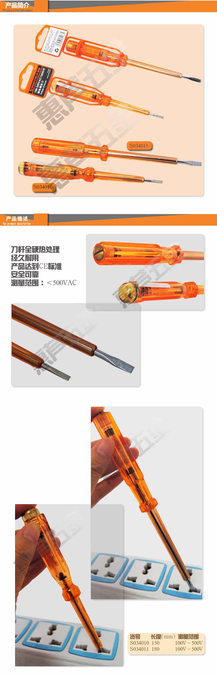 產(chǎn)品參數(shù)及特點(diǎn)貨號(hào)長(zhǎng)度(mm)測(cè)量范圍重量kg價(jià)格元S034010-W150100V-500V6.84S034011-W180100V-500V7.92