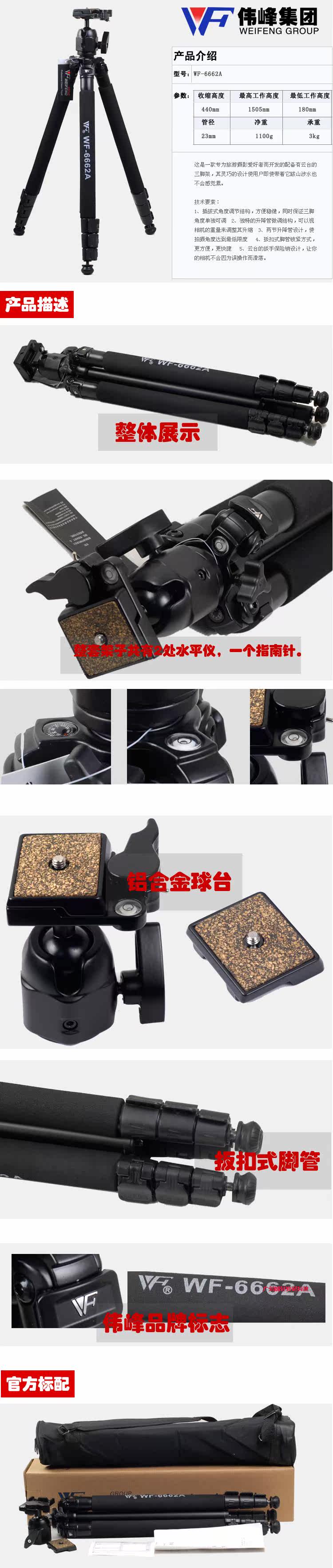 ·偉峰“旅行者”系列輕型三腳架,均選用優(yōu)質(zhì)鋁合金并經(jīng)過(guò)特殊表面處理,通過(guò)嚴(yán)格檢驗(yàn)制作而成,輕盈而堅(jiān)固,便于攜帶。并且能夠適應(yīng)粗劣環(huán)境下復(fù)雜的地形。