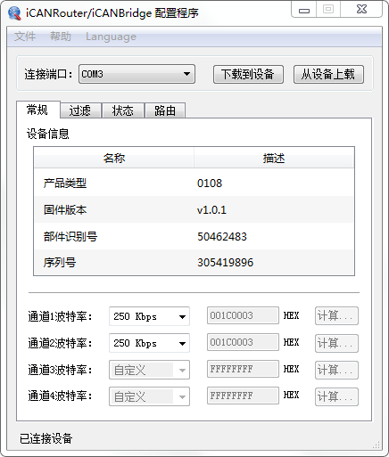 iCANHub-P4可通過(guò)異步串行通訊接口連接到PC來(lái)配置。通過(guò)iCANgw.exe配置軟件設(shè)置CAN通道波特率、CAN消息接收濾波等,使用簡(jiǎn)單,支持即時(shí)生效,設(shè)備配置完成后無(wú)需任何操作即可投入工作。
