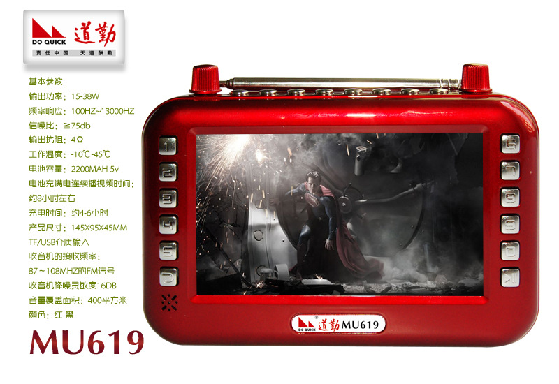 6、帶4.3寸TFT液晶高清彩屏顯示,TF/USB和FM,MP3 MP4,MP5音樂,視頻文件播放,收音機(jī)/相片、電子書閱覽等播放功能,良好的聽覺效果.