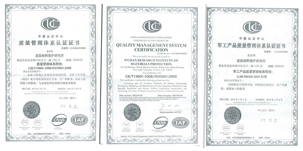 武漢材料保護(hù)研究所始建于1953年,原為機(jī)械工業(yè)部直屬大型骨干研究所,隨著我國科技體制改革的發(fā)展,轉(zhuǎn)制為科技型企業(yè),現(xiàn)隸屬于國務(wù)院國有資產(chǎn)管理委員會管理的機(jī)械科學(xué)研究總院。經(jīng)過50余年的發(fā)展,武漢材料保護(hù)研究所已成為表面處理工藝、材料、設(shè)備的研發(fā)與生產(chǎn),表面覆蓋層性能測試、產(chǎn)品質(zhì)量檢測,表面保護(hù)工程設(shè)計與施工的高新技術(shù)企業(yè),并通過GB/T19001-2008/ISO9001:2008質(zhì)量管理體系認(rèn)證,GJB9001B-2009軍工產(chǎn)品質(zhì)量管理體系認(rèn)證。
