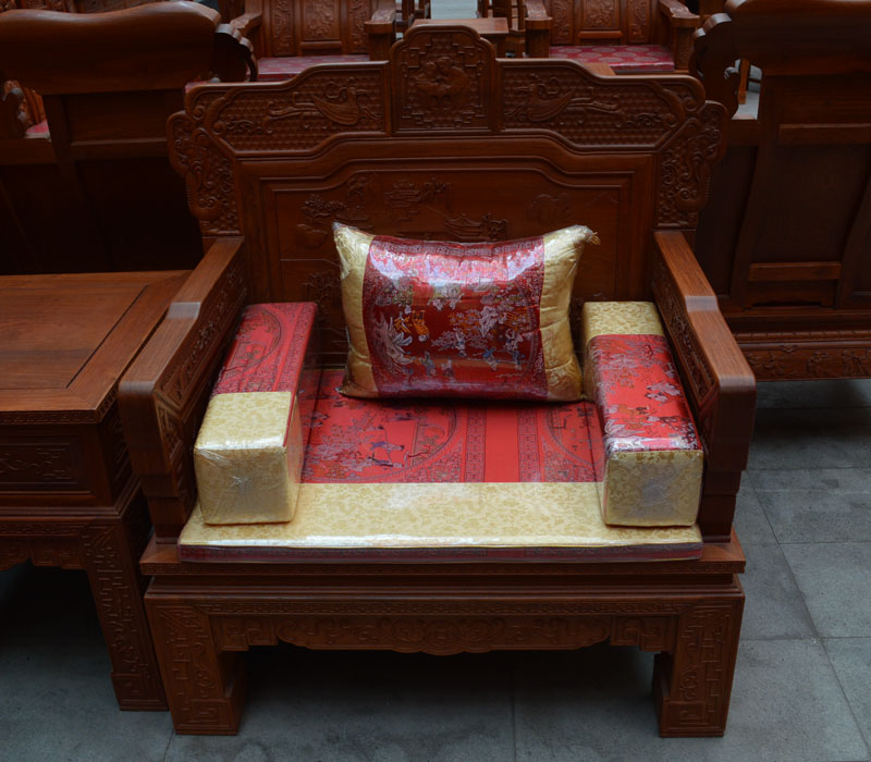 錦緞紅木沙發(fā)墊常規(guī)要求是:根據(jù)扶手凹凸形狀每個沙發(fā)定做,嵌入放置后不會移動;錦緞套邊緣有嵌線,拉鏈在后面。