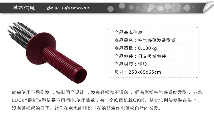 [商品單位]把[單個(gè)重量]0.100千克[商品材質(zhì)]塑膠[商品包裝]日文吸塑包裝[商品產(chǎn)地]中國(guó)[裝箱數(shù)量]100[外箱規(guī)格]60.5*43*52.5★單手輕鬆將髮束捲起~需搭配吹風(fēng)機(jī)一起使用喔!