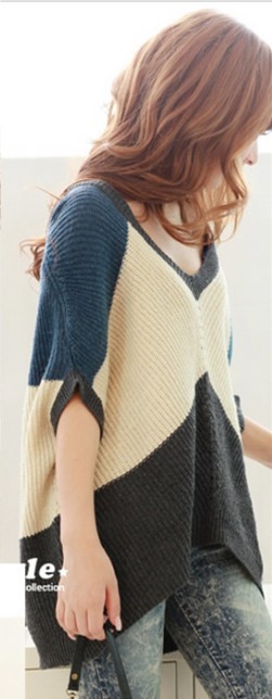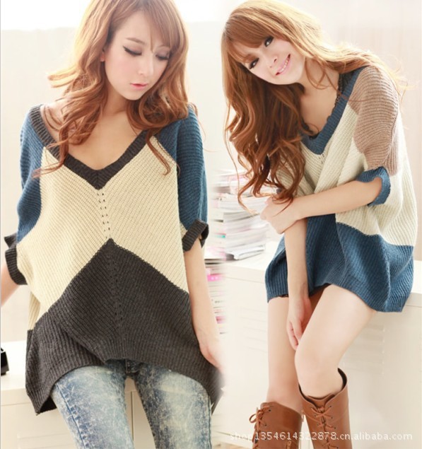2012秋冬裝新款韓版女裝 時(shí)尚中袖蝙蝠袖針織V領(lǐng)寬松毛衣