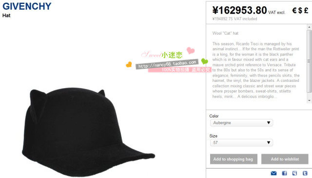 此帽子原版是紀(jì)梵希2012年秋冬秀場的一頂趣味十足的貓耳朵帽子,又被稱為“貓耳帽”