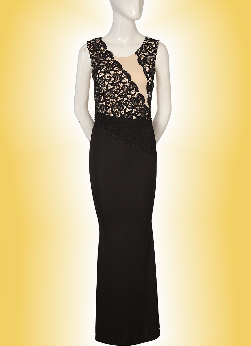 2014 ebay熱賣晚禮服 歐美新款黑色蕾絲拼接無(wú)袖長(zhǎng)裙 女