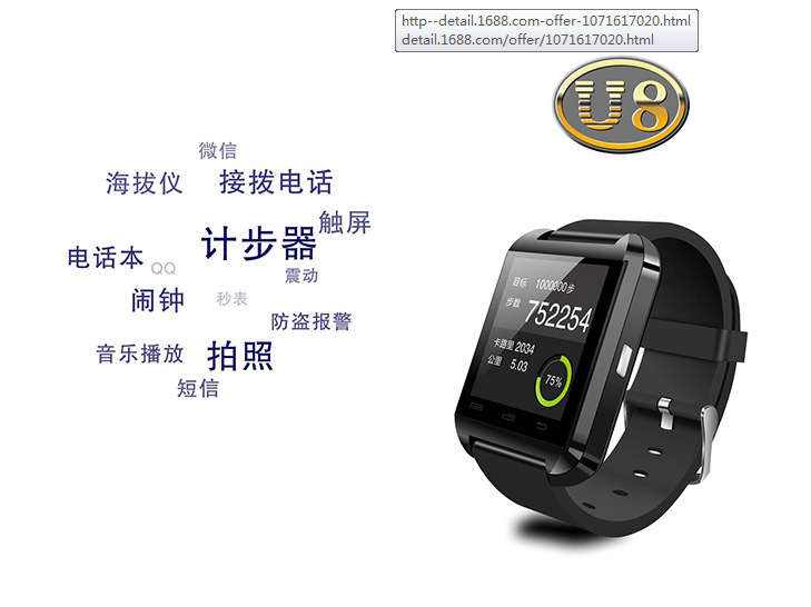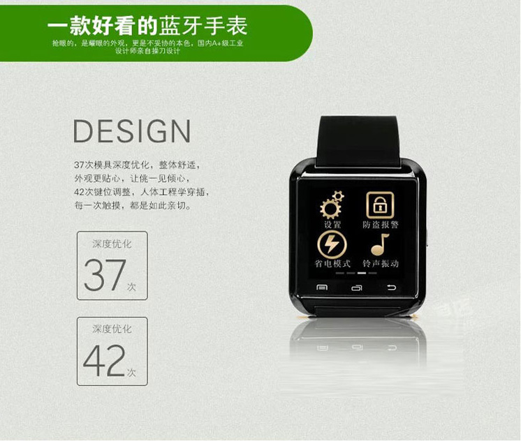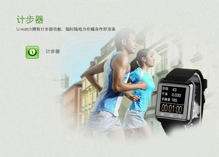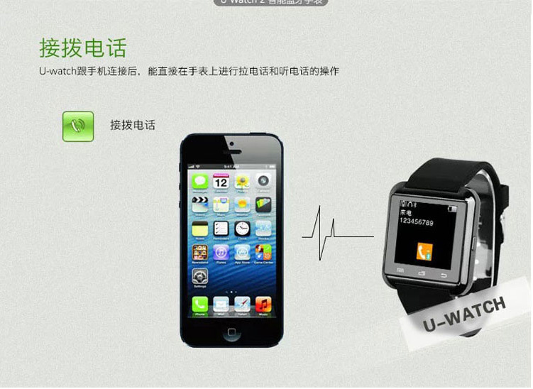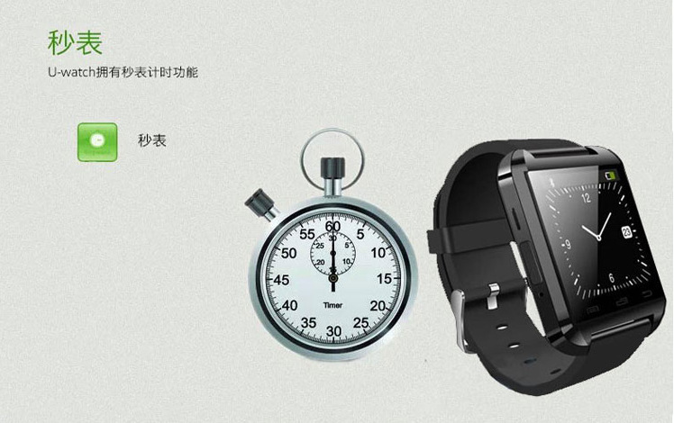 功能簡介:支持觸屏操作、有撥號盤可隨意按號撥打、同步手機電話本、同步手機mp3音樂播放、來電顯示、來電震動或鈴音提醒、計步器、氣壓計、高度計、秒表、鬧鐘、防盜報警,安卓的手機大部份可同步手機短信、QQ 微信等信息提示或查看、可遙控手機拍照。
