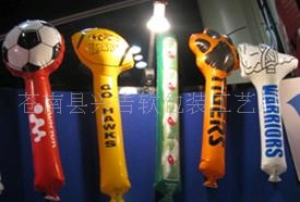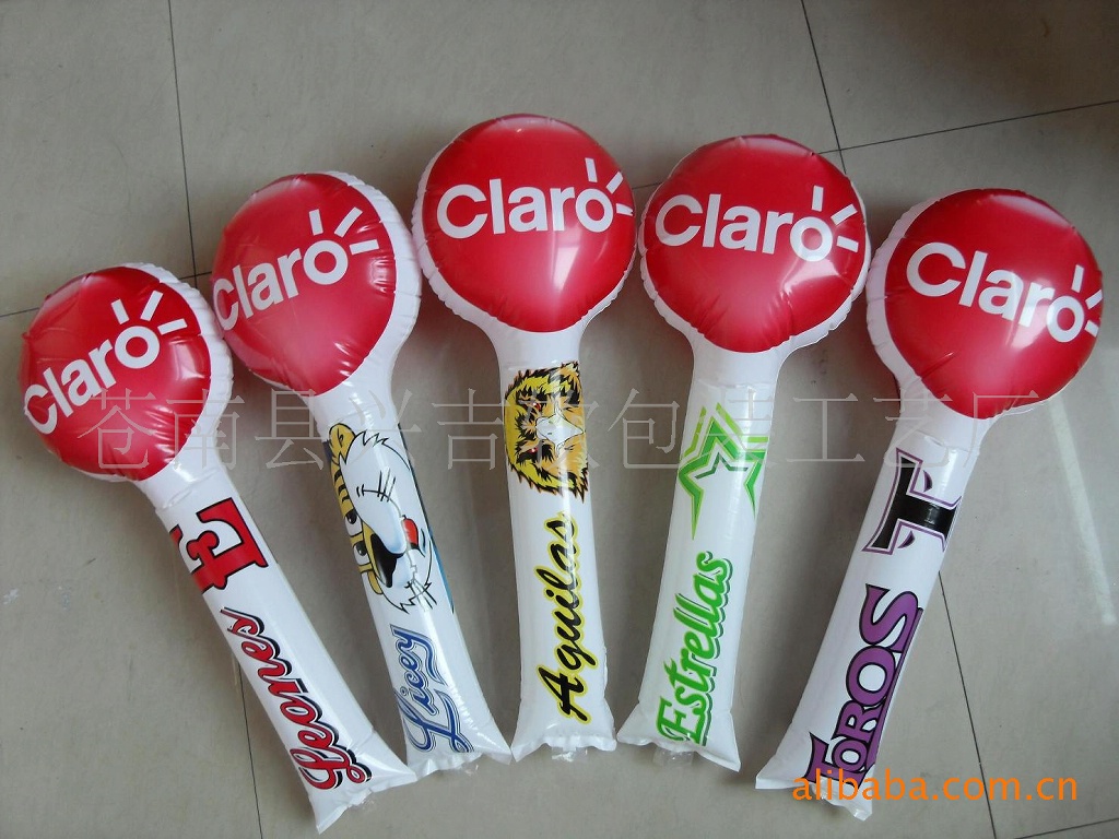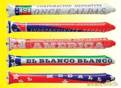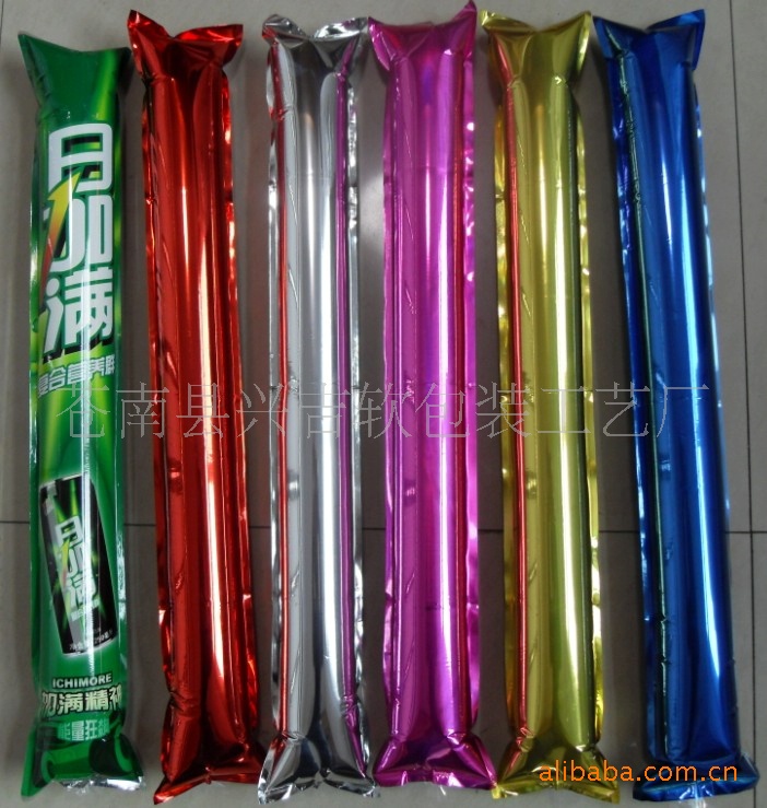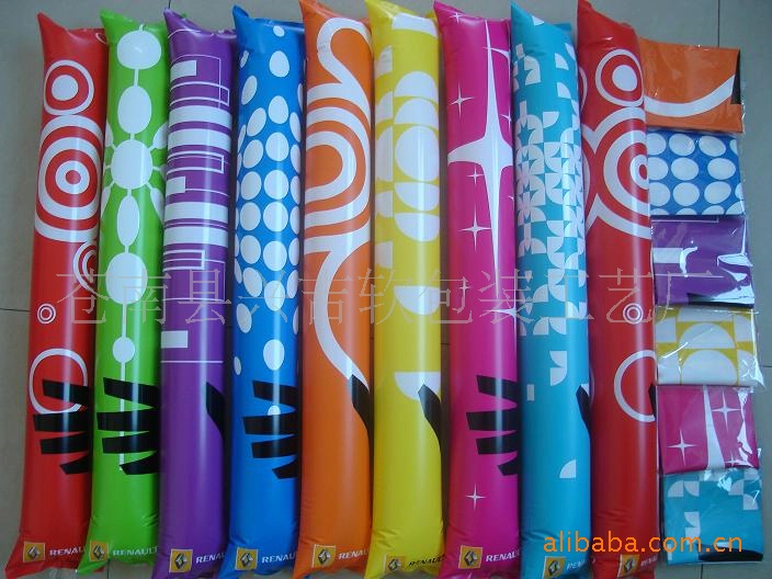充氣棒用新引進高強度進口PE料制成,拉伸強度為130,耐磨不漏氣,兩棒敲擊可發(fā)出金屬音響,制造熱烈氣氛,鼓舞士氣,正反面可印全彩圖案或圖片,8色全自動電腦印刷機,印刷技術高超,色彩鮮艷,更能提高廣告效果.,充氣后自動封口。