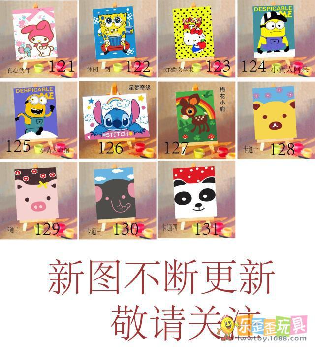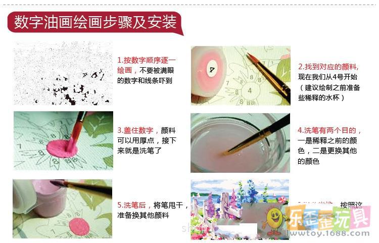 每條顏料條上都粘貼有數(shù)字標(biāo)貼,仔細(xì)觀察原始數(shù)字畫(huà)板上各個(gè)小塊的數(shù)字號(hào)碼,然后選出顏料條中對(duì)應(yīng)的數(shù)字顏料用畫(huà)筆沾上在畫(huà)板上繪制。顏料的顏色數(shù)量較多,在繪畫(huà)過(guò)程中建議先完成一種顏色后,再填第二種顏色,逐步進(jìn)行繪制。我們的顏料是丙稀顏料,具有一定的覆蓋性,即使您填錯(cuò)了顏色,也可以覆蓋糾正。繪畫(huà)過(guò)程中如有疑問(wèn)還可參照樣圖進(jìn)行繪制。