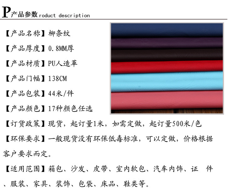 麒翔皮革成立于1999年,公司總部設(shè)立在浙江省義烏市,公司擁有完整科學(xué)的質(zhì)量管理體系。網(wǎng)店布榮貿(mào)易有限公司誠信經(jīng)營、服務(wù)周到、在業(yè)界得到廣泛的認(rèn)可。十幾年來本公司專注生產(chǎn)經(jīng)營各種PU、PVC、壓花人造革,適用于皮帶、箱包、服裝、證件、商標(biāo)、球類、沙發(fā)、玩具、鞋、工藝品及裝飾。花紋領(lǐng)先獨(dú)特、種類繁多、并配合客戶的產(chǎn)前開發(fā)!常規(guī)貨都有大量現(xiàn)貨批發(fā)!
