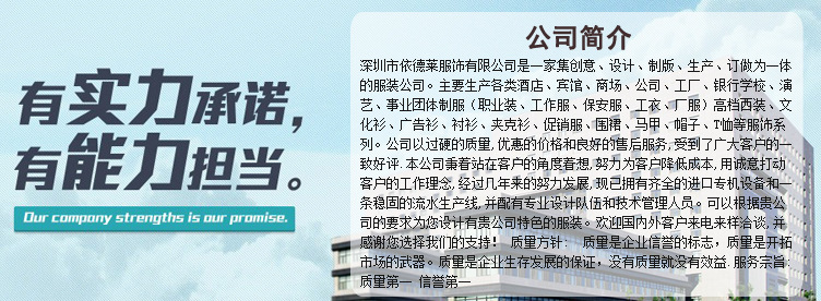 深圳市依德萊服飾有限公司是一家集創(chuàng)意、設(shè)計(jì)、制版、生產(chǎn)、訂做為一體的服裝公司。主要生產(chǎn)各類酒店、賓館、商場、公司、工廠、銀行、學(xué)校、演藝、事業(yè)團(tuán)體制服(職業(yè)裝、工作服、保安服、工衣、廠服)、高檔西裝、文化衫、廣告衫、襯衫、夾克衫、促銷服、圍裙、馬甲、帽子、T恤等服飾系列。
