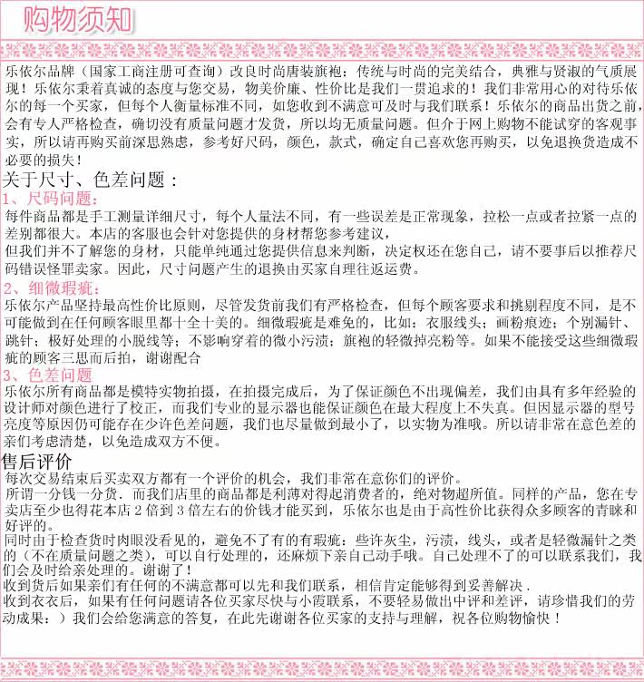 所有尺寸均為平鋪測量,建議選擇比自己凈 三圍略大的碼數 ,尤其是真絲棉麻等天然纖維面料需考慮其縮水率。如不能確認尺寸 的買家朋友,可以留言提供您準確的三圍凈尺寸,或者身高體重,以便客服協(xié)助您衡量 選擇接近合身的碼數 ,一般而言,平常您穿什么碼數旗袍大概也選擇什么碼數。另 外,請買家朋友先留言或旺旺詢問需要的碼數,以免斷貨,多謝包涵體諒!