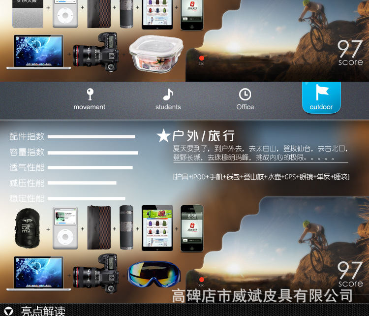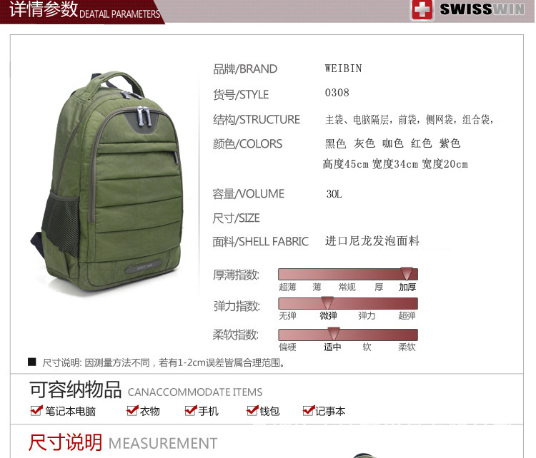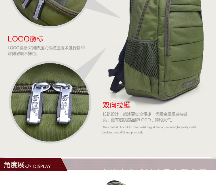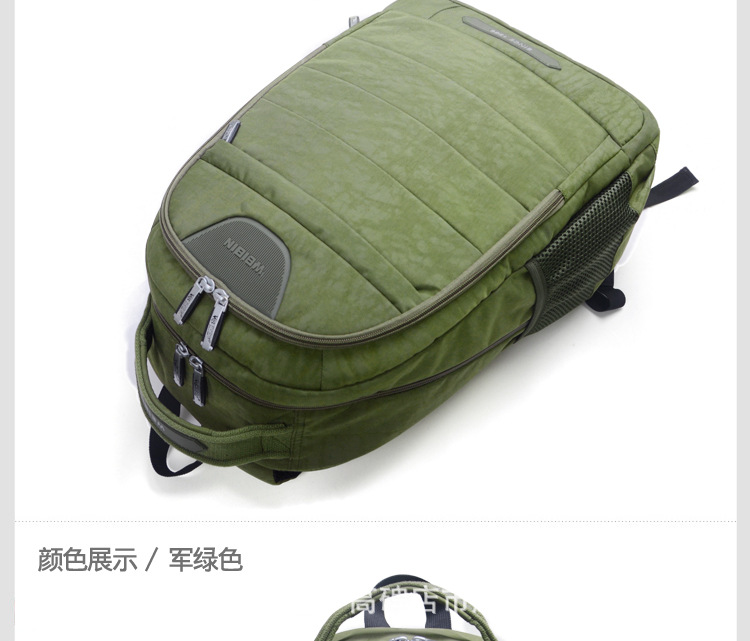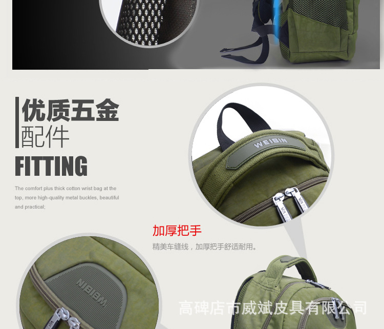 采用尼龍面料,具有防水功能,極其富有質(zhì)感,做工精致,每一個細(xì)節(jié)都體現(xiàn)了威斌的不凡魅力。豪華精致的做工與設(shè)計搭配富有品位的您,適合任何場合。威斌箱包極盡奢華之設(shè)計,顯示您尊榮華貴的象征,體現(xiàn)與眾不同的氣質(zhì)!讓您脫穎而出,備受注目!此包包人性化,多功能設(shè)計,讓您帶著輕松愉快的心情工作休閑!