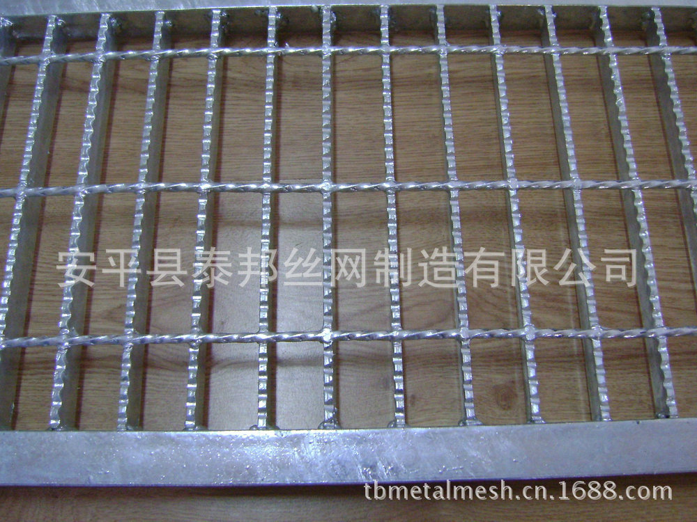 壓鎖鋼格板:有一定尺寸的普碳扁鋼、不銹鋼、鋁板經(jīng)開(kāi)槽(孔)、插接壓鎖、焊接、精整等工序制造而成。在承載扁鋼和橫桿的每個(gè)交叉點(diǎn)處,通過(guò)壓力將橫桿壓入承載扁鋼或預(yù)先開(kāi)好槽的承載扁鋼中,將其固定的鋼格板叫做壓鎖鋼格板。壓鎖鋼格板的橫桿也采用扁鋼。