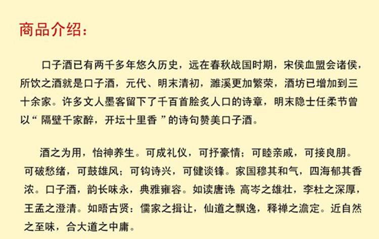 以?xún)?yōu)質(zhì)高粱、小麥、豌豆為原料,在吸收口子酒傳統(tǒng)釀酒釀造工藝基礎(chǔ)上,采用窖池發(fā)酵、長(zhǎng)期地窖儲(chǔ)存,精心釀造而成,具有“窖香濃,入口