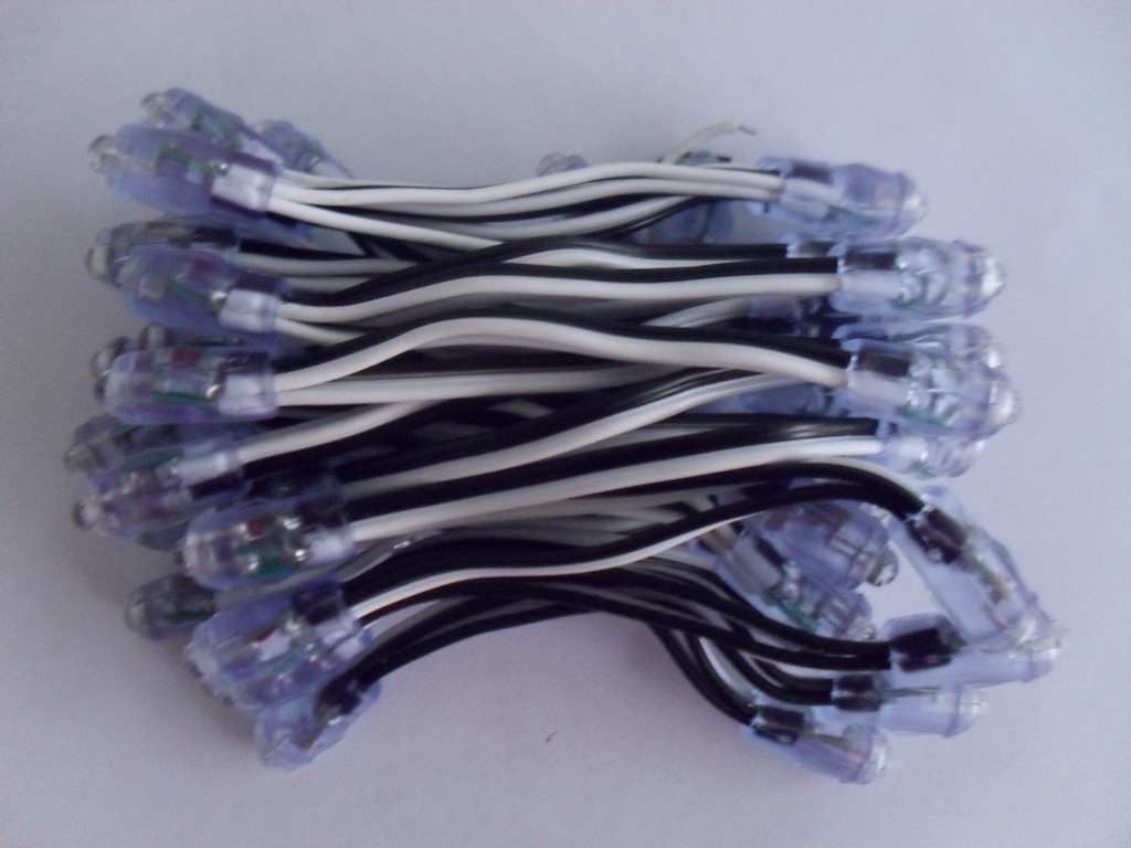 6、接線:每50個燈接一個回路.所有燈先串連再50個并聯(lián)接5V電源。并注意所有的燈到電源的線不能太長,其所有的連接線也不能是太小的線,必須是大于1平方米的線,往往客戶在發(fā)現(xiàn)燈與燈的亮度一邊與另一邊有差異時候,很有可能是接線沒有按照50個一回路或者那個不太亮的燈離電源的距離太遠(yuǎn),或者是所用線太細(xì)。其次開關(guān)電源的總功率必須大于或等于所接電源上面的總燈數(shù)量的總功率的120%.