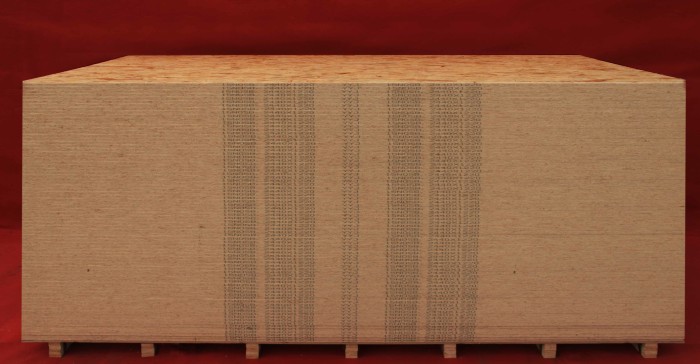 寶源精木板(OSB)為三層結構,上下兩層刨片呈縱向排列,芯層呈橫向排列,整體結構均勻,穩(wěn)定不變形,靜曲強度高,具有良好的加工性能。