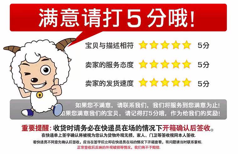 若有損壞、數(shù)量不符、被拆包等問(wèn)題請(qǐng)拒收,并在驗(yàn)收當(dāng)場(chǎng)與我們聯(lián)系,并請(qǐng)派送人員簽字證明,以保證您的利益。對(duì)于沒(méi)有驗(yàn)貨就簽收的買(mǎi)家,我們將視為客戶已經(jīng)認(rèn)可貨物沒(méi)有問(wèn)題。未經(jīng)驗(yàn)貨簽收后,出現(xiàn)的缺少,破損等糾紛,本店不承擔(dān)任何責(zé)任,買(mǎi)家自負(fù)。謝謝合作!