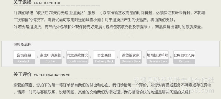 歡迎訂購本社產(chǎn)品,本社以質(zhì)量為目標(biāo),請認準手機號為 的本人操作,qq17 旺旺 耿平茶葉合作社。其它聯(lián)系人,本社不授權(quán)聯(lián)系。2014年9月10日 理事長:吳耿平 安溪縣耿平茶葉專業(yè)合作社宣。出重拳,打擊假冒本社聯(lián)系人,出售本社產(chǎn)品。