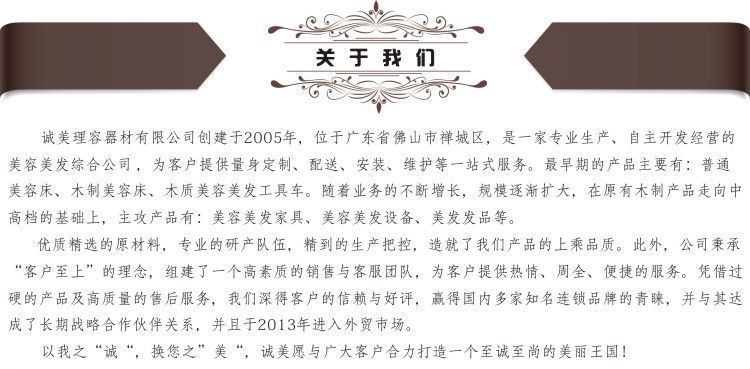 我司長(zhǎng)期與大型連鎖美容院、休閑會(huì)所等合作,積累了豐富的經(jīng)驗(yàn),生產(chǎn)的木制美容床、工具車等木制產(chǎn)品,以其優(yōu)質(zhì)、耐用、簡(jiǎn)約高檔的特性,受到眾多美容院的一致認(rèn)可與贊揚(yáng)。同時(shí)在原有木床等樣品基礎(chǔ)上,根據(jù)客戶的要求進(jìn)行合理修改,為客戶量身定做,為客戶打造的樣式。