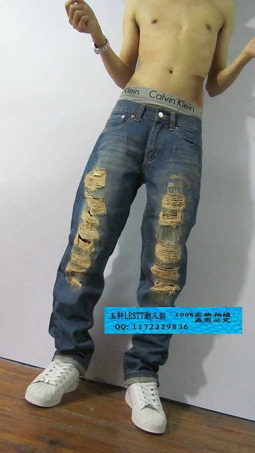 新品秋裝陳冠希潮牌韓版 乞丐破洞牛仔褲 男 直筒牛仔褲 林彎彎