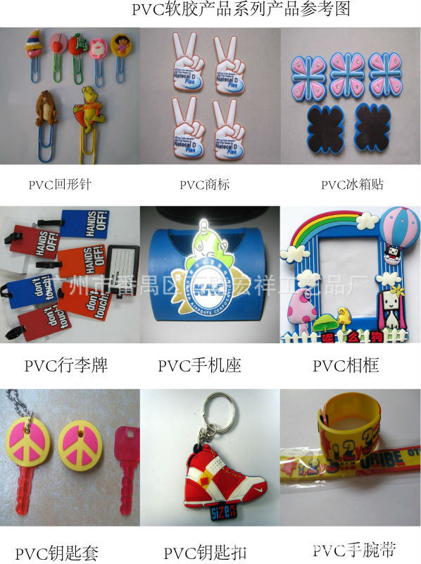 PVC軟膠系列:PVC軟膠匙扣、PVC相架、PVC手機(jī)座、PVC商標(biāo)牌、PVC行李牌等.