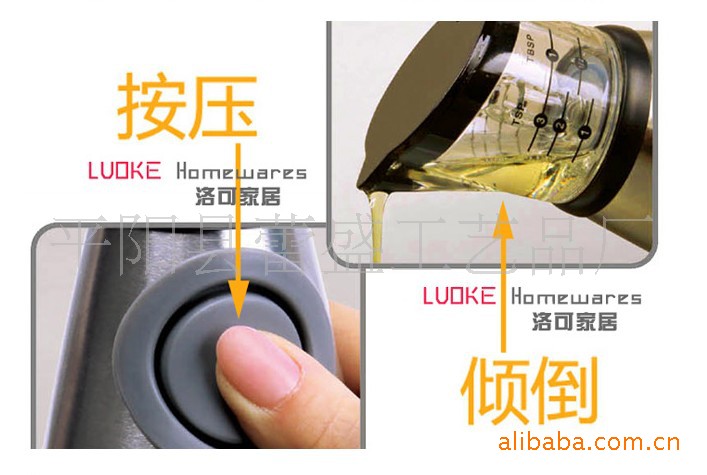 ●描述:北歐風格的可計量健康油瓶,設(shè)計精良,只要輕輕按一下油瓶中部的硅膠按鈕,油就可以進入瓶子上部的測量管,讓您輕松掌握用油量,健康隨食隨意!~ 可計量油瓶 先擠壓橡膠部分將油、醬油、醋等抽到計量部位,做菜時就可以清楚地把握好量。