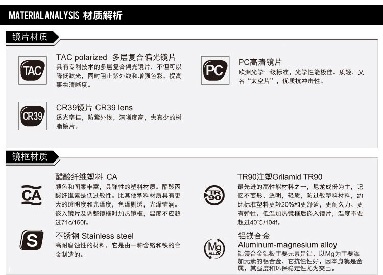 按照國際標(biāo)準(zhǔn)的規(guī)定,太陽鏡被列為個人眼部保護(hù)用品的范疇,因為太陽鏡是在夏季戴,主要功能是為了遮擋刺眼陽光。然而,國際標(biāo)準(zhǔn)又把太陽鏡細(xì)分為“時裝鏡”和“一般用途用鏡”。標(biāo)準(zhǔn)中對“時裝鏡”的質(zhì)量要求比較低。因為“時裝鏡”主要突出的是款式,佩戴者注重的是裝飾,而不是保護(hù)功能。標(biāo)準(zhǔn)中對“一般用途用鏡”的質(zhì)量要求則比較嚴(yán),其中包括對防紫外線,以及屈光度和棱鏡度的指標(biāo)要求。