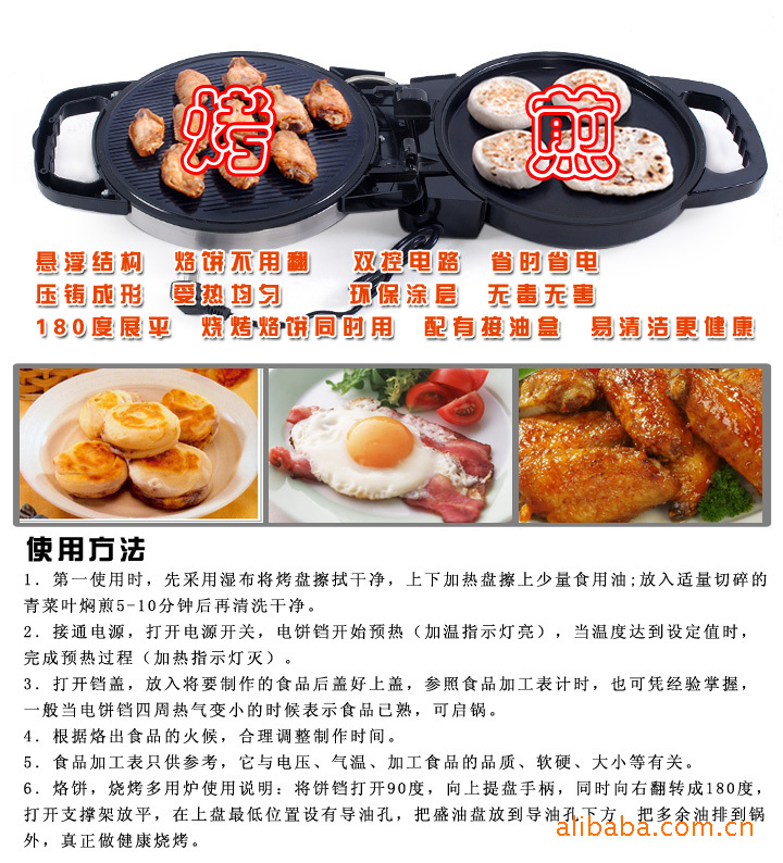 6.適用于加工各種燒烤、烙、煎的食品,如大餅、餡餅、發(fā)面餅、鍋貼、玉米餅、烤肉、煎魚(yú)、油燜大蝦等