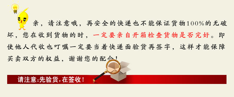時(shí),請(qǐng)務(wù)必當(dāng)面檢查包裹是否有破損,同時(shí)打開(kāi)包裝,檢查您