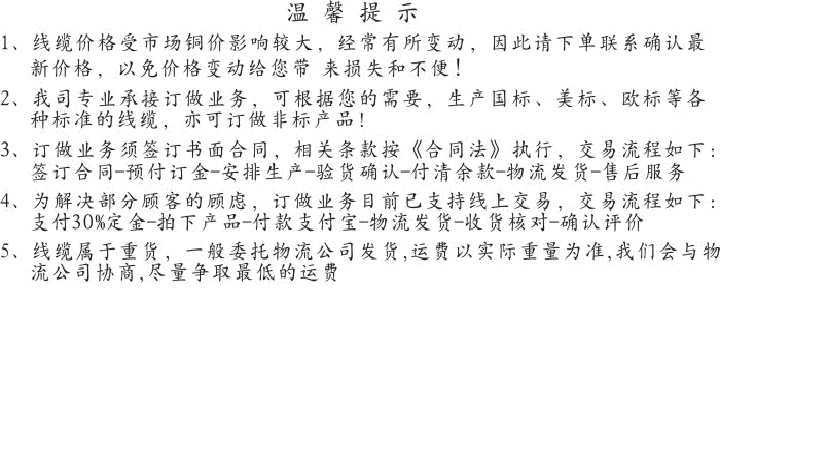 2.運(yùn)輸與運(yùn)費(fèi):電線屬于重貨一般都是通過(guò)物流公司發(fā)貨,運(yùn)費(fèi)以實(shí)際重量為準(zhǔn)。廣佛莞深地區(qū)免費(fèi)配送,其他地區(qū)滿5000免運(yùn)費(fèi)或者補(bǔ)差額運(yùn)費(fèi)。廣州地區(qū)1-2天,粵東地區(qū)一般2-3天,其他地區(qū)3-5天,偏遠(yuǎn)地區(qū)6-8天