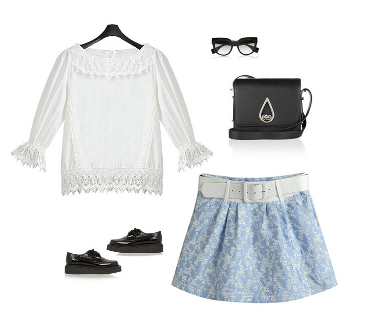 ¥69.00歐洲站2015春新款時(shí)尚兩件套蕾絲衫加印花短裙修身套裝6280