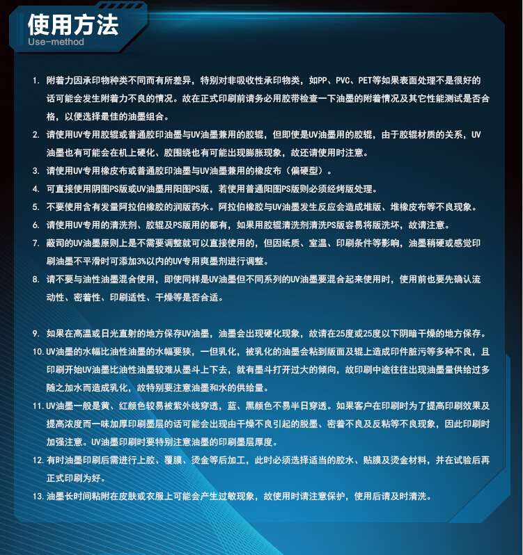 8、請不要與油性油墨混合使用,即使同樣是UV油墨但不同系列的UV油墨要混合起來使用時,使用前也要先確認(rèn)流動性、密著性、印刷適性、干燥等是否合適。
