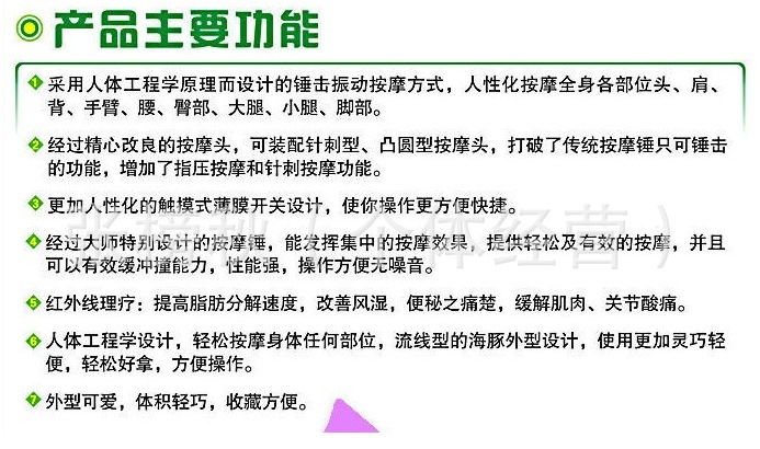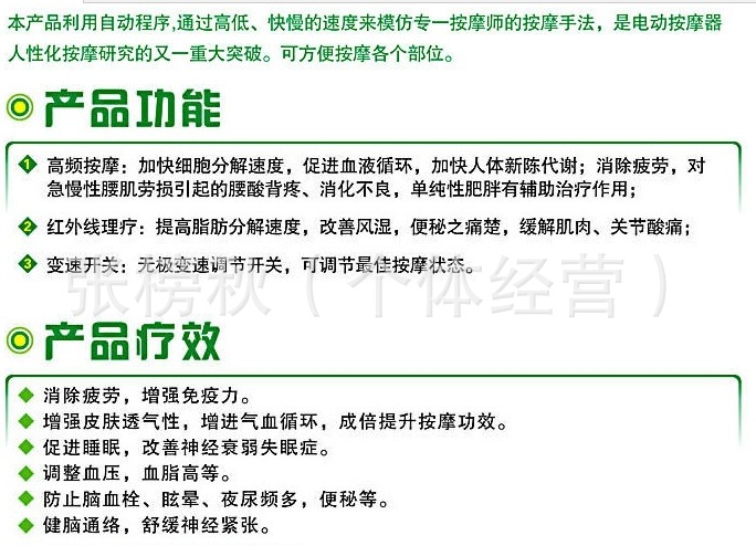 詳細(xì)介紹:本產(chǎn)品外形設(shè)計(jì)為大型按[mo]器,力度更大,按[mo]部位更多,可充分按[mo]頸椎、肩膀等部位;另配8個(gè)按[mo]頭,腰部及腿部等部位進(jìn)行重點(diǎn)按[mo] 。