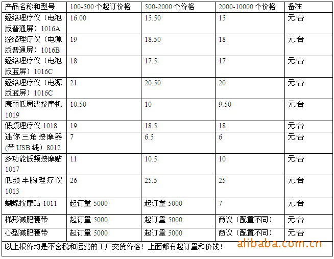 產(chǎn)品功能: 微電腦減肥瘦身腰帶擁有6種不同震蕩模式,10檔強(qiáng)度,讓脂肪相互撞擊,從而分解多余的脂肪,適合不同的人群需求 擁有碎脂機(jī),從此減肥不用上健身房,不用節(jié)食. 能讓你在上班,購(gòu)物,看電視,做家務(wù)...任何時(shí)間,任何地點(diǎn)都能使用. 不僅小腹,連大腿,手臂,臀部任何一處肥胖的部位都能使用.想瘦哪里就瘦哪里!整套產(chǎn)品包含: ①一個(gè)控制器 ;②一條束帶 ;③兩條可伸縮的綁帶 ;④兩粒電池;⑤100mL按[mo]油1瓶 。使用一粒CR2032鋰電池,產(chǎn)品操作非常簡(jiǎn)便,只有三個(gè)控制鍵進(jìn)行操作,而且程序會(huì)自動(dòng)運(yùn)行,當(dāng)您選擇好鍛煉部位,打開(kāi)電源,調(diào)節(jié)好強(qiáng)度后程序自動(dòng)運(yùn)行12分鐘,12分鐘后自動(dòng)停止,如果您想繼續(xù)進(jìn)行,請(qǐng)重新開(kāi)啟。注意使用時(shí)必須貼著皮膚使用,而且使用時(shí)涂上按[mo]油效果更佳, 使用后一、兩分鐘內(nèi),可能會(huì)有不同程度的不適反應(yīng)(如癢、麻、多汗)等感受,均屬正常反應(yīng)。 1. 微電腦減肥瘦身腰帶有6種不同震蕩模式,讓脂肪相互撞擊,從而分解多余的脂肪; 2. 肌肉鍛煉單元工作時(shí)產(chǎn)生電脈沖; 3. 產(chǎn)品操作非常簡(jiǎn)便,只有三個(gè)控制鍵進(jìn)行操作而且程序會(huì)自動(dòng)運(yùn)行; 4. 注意使用時(shí)必須粘著皮膚,涂上瘦身精華素效果更佳,使用后一、二分鐘內(nèi),可能會(huì)有不同程度的不適反應(yīng)(如癢、麻、多汗)等感覺(jué),均屬正常反應(yīng)。 技術(shù)參數(shù): 外箱尺寸: 58.5*46.5*53cm 裝箱數(shù)量:80PCS