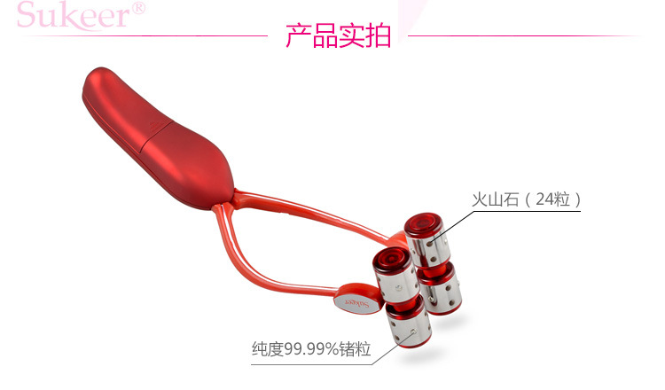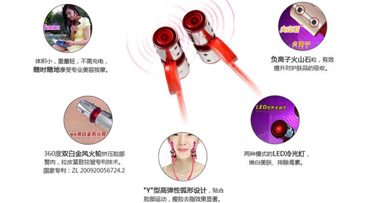 塑可兒瘦臉風(fēng)火輪是從日本引進(jìn)技術(shù),在中國取得專利,專利號(hào)ZL6724.2。采用風(fēng)火輪震動(dòng)按[mo]臉部贅肉,配合純度99.9%鍺粒子和火山石循環(huán)推脂、燃脂,特別針對(duì)大圓臉、大肉臉、嬰兒肥,能有效瘦臉。內(nèi)置2種模式冷光燈,冷光美容促進(jìn)皮膚血液循環(huán),排毒養(yǎng)顏;內(nèi)含火山石粒,可以調(diào)節(jié)人體因過度疲勞和生活不規(guī)律引起的過量正電位。Y型風(fēng)火輪滾輪設(shè)計(jì),震動(dòng)、按[mo]雙效合一。每天按[mo]9分鐘,隨時(shí)隨地輕松美容。在日本、韓國銷售非?;鸨?,顧客滿意度達(dá)到95%以上。