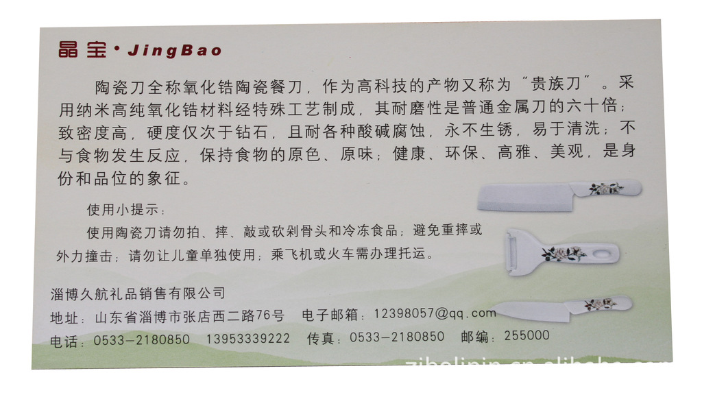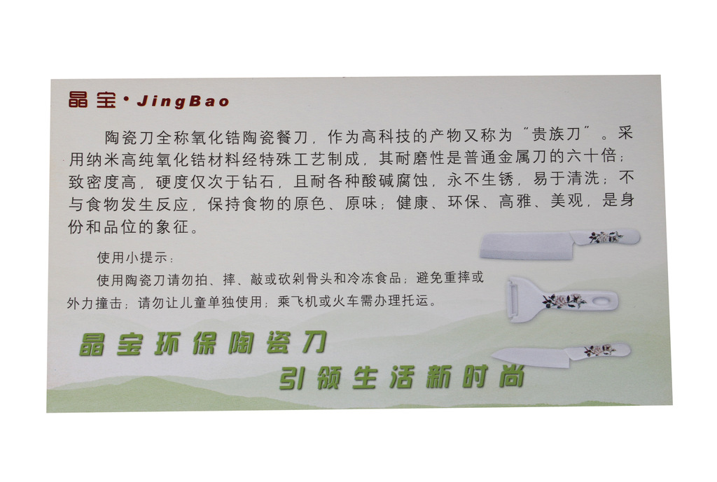 下面是這晶寶陶瓷刀說明書 可以根據(jù)客戶的要求裝入代生產(chǎn)商家地址電話等詳細(xì)資料或者只有說明的說明書。