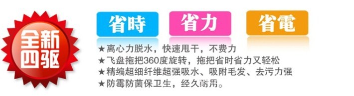 好神拖新型脫水裝置,可自行控制布條干濕度,兼具清潔、吸塵、吸水效果,省時(shí)方便,快速干燥更安全。新型拖把頭專利設(shè)計(jì),可以360度任意旋轉(zhuǎn),均勻清潔、輕松深入任何角落。 獨(dú)特布條纖維,強(qiáng)力清潔、耐磨抗菌,不會(huì)刮傷各式地板或其它清潔面的精致表面。超強(qiáng)省力/省時(shí)/更省電:創(chuàng)新概念,結(jié)合吸塵器與脫水機(jī)設(shè)計(jì),擁有吸塵器般的強(qiáng)力清潔效果,同時(shí)也能達(dá)到百分之百完全脫水效果,不臟您的玉手,不費(fèi)體力,不需插電,操作簡(jiǎn)單,一套成型,大人小孩都上手。
