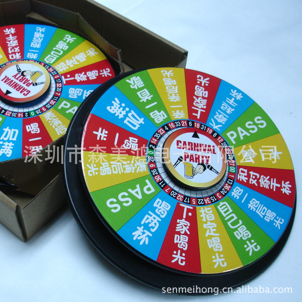 底盤上有指示箭頭,當(dāng)您轉(zhuǎn)動上面印有酒令內(nèi)容的圓盤停下后,停靠在指示箭頭區(qū)域的,您就該按指示完成指令。新奇有趣,是喝酒朋友的,酒水行業(yè)促銷禮品的。