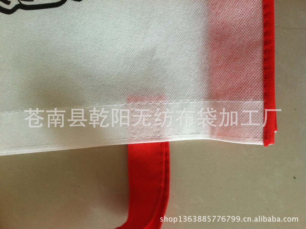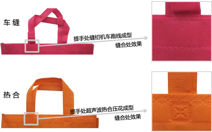 【熱合】以超聲波熱壓成型,承重約3KG左右。優(yōu)點(diǎn)是美觀,缺點(diǎn)是拎袋時(shí)手臂幅度過大,拎手處容易斷。