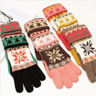 批發(fā)新款大雪花可愛保暖五指分指針織雙層毛線加厚手套女秋冬季